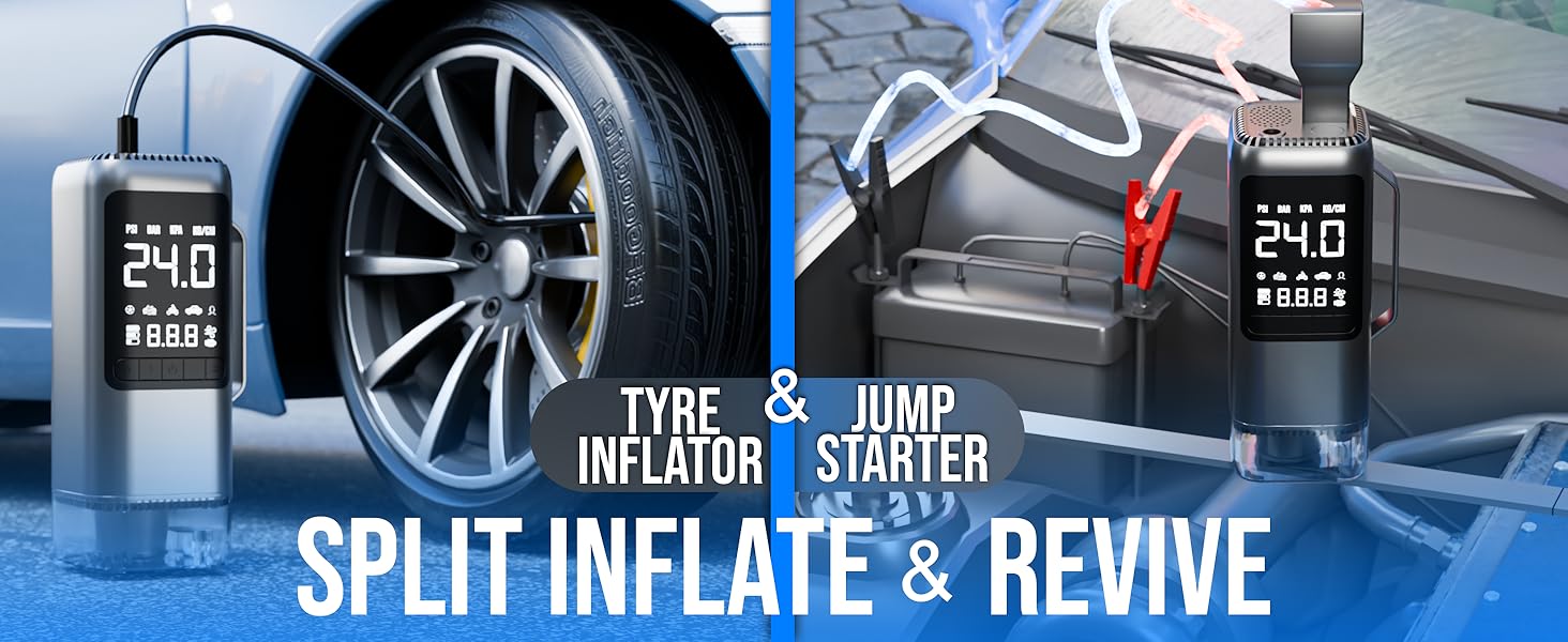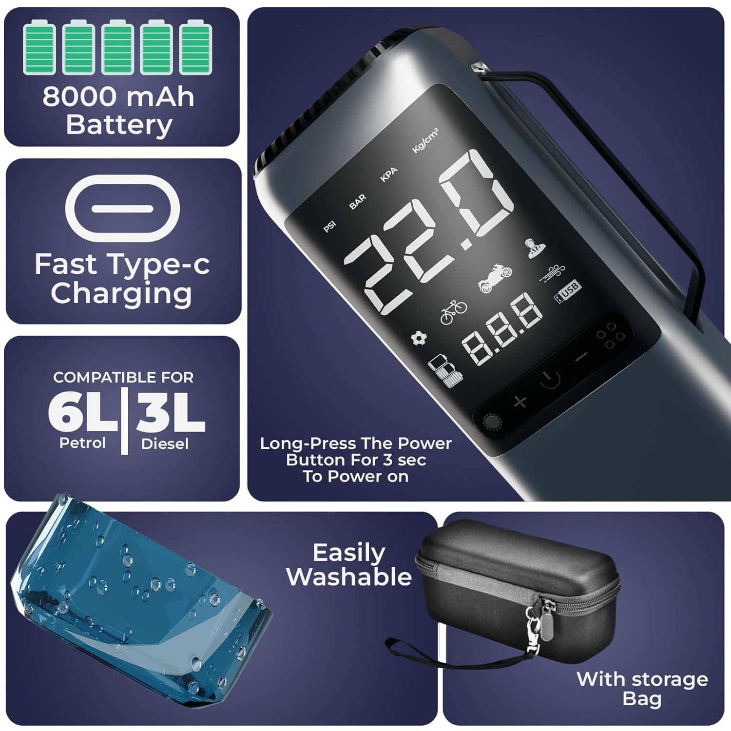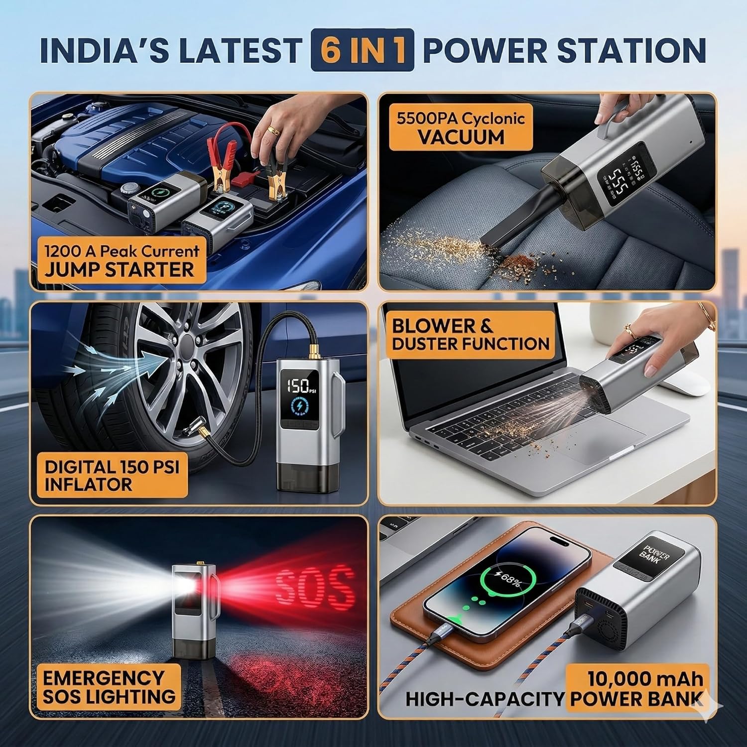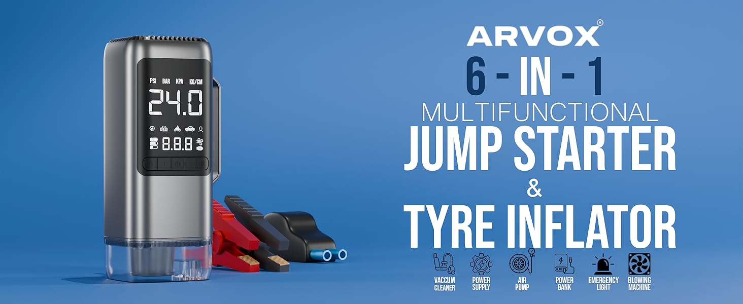 ARVOX 6 in 1 Tyre Inflator for Car,Bike with Car Battery Jump Starter,Vaccum Cleaner & Power Bank,3X Faster Inflation Air Inflator Pump(10,000 mAH)(Grey), 23 Liters Per Minute